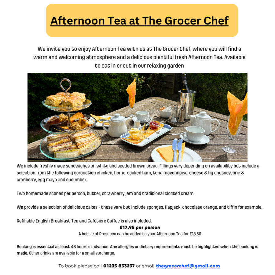 The Grocer Chef is a warm and welcoming venue who welcome well behaved dogs and children, set in the beautiful rural village of Ardington. The establishment consists of a licensed tearoom, open from 8am until 4pm Monday and Saturday. We serve a variety hot and cold foods and drinks, including breakfast, lunch, afternoon tea as well as home made cakes and delicious scoop ice creams. We offer unique products as well that you won't find anywhere in the local area. We want to provide our customers with something different whilst enjoying a comfortable environment. We are also a general store, which is always stocked with a range of food and alcohol as well as newspapers and magazines, household items and pet food. Takeaway food is also available and the garden provides a picturesque alternative to indoor seating. We welcome lone individuals and can also accommodate large groups. We are a great place to meet for any purpose and you won't be disappointed by your visit and what you find.