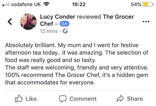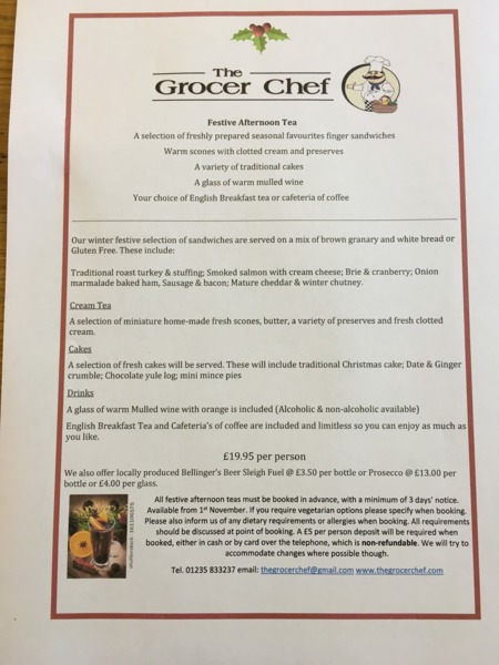 Festive Afternoon Tea this year is available to take away or be delivered locally. You get to enjoy all the yummy Christmassy flavours in fresh sandwiches, cakes and scones in the warmth of your home. Boxes are available to order by email thegrocerchef@gmail.com or by phone 01235 833237 for yourself or as treats for friends or family.