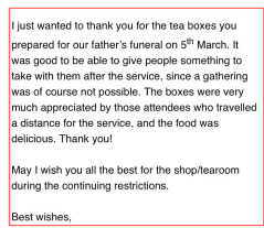We can help take the pressure off of organising a wake following a funerel. In these challenging times traditional funerals with unlimited amounts of friends and family paying their respects and physically attending is difficult; particularly being unable to offer support and condolences after the service. We can provide Afternoon Tea boxes for you to hand out to your guests after the service for them to enjoy. They can be tailored to your individual requirements and include favourites of the deceased, for example. This is a lovely token to remind the mourners of the individual. They can be for various numbers of people. Delivery locally is available to crematoriums and cemetries at the time you require. Please contact us to discuss what we can help you with. 01235 833237.